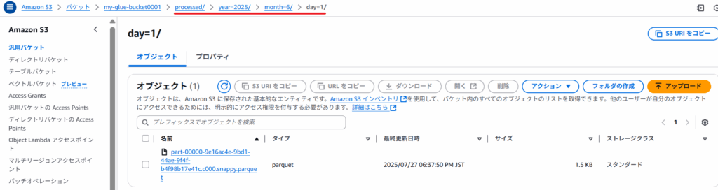 ・加工済みデータ: s3://my-glue-bucket0001/processed/year=○○○○/month=○○/day=○○/part-0000.parquet
