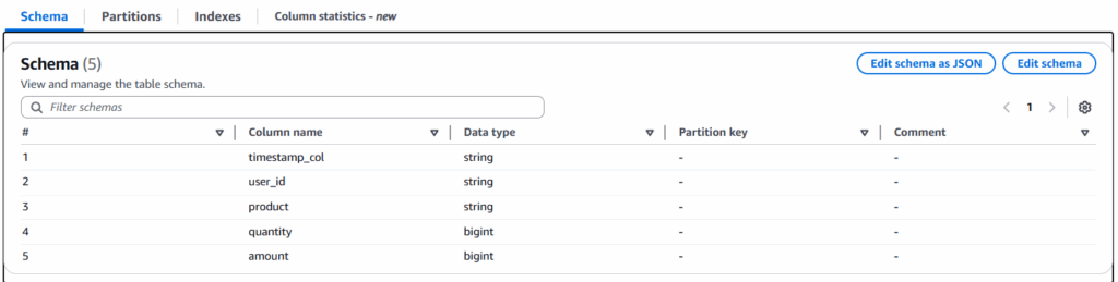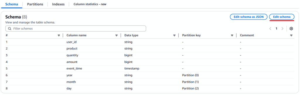 3. raw テーブルが作成され、timestamp_coluser_id などのカラムが正しく認識されていることを確認します。