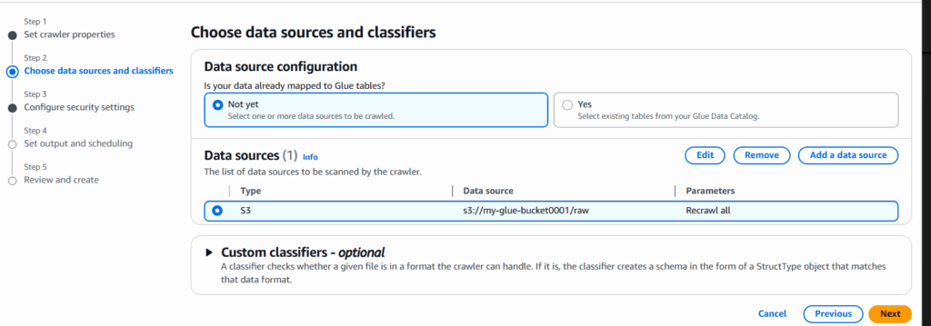 3. 「データソースを追加(Add a data source)」をクリックし、S3のパス:s3://my-glue-bucket/raw を入力し「次へ」
